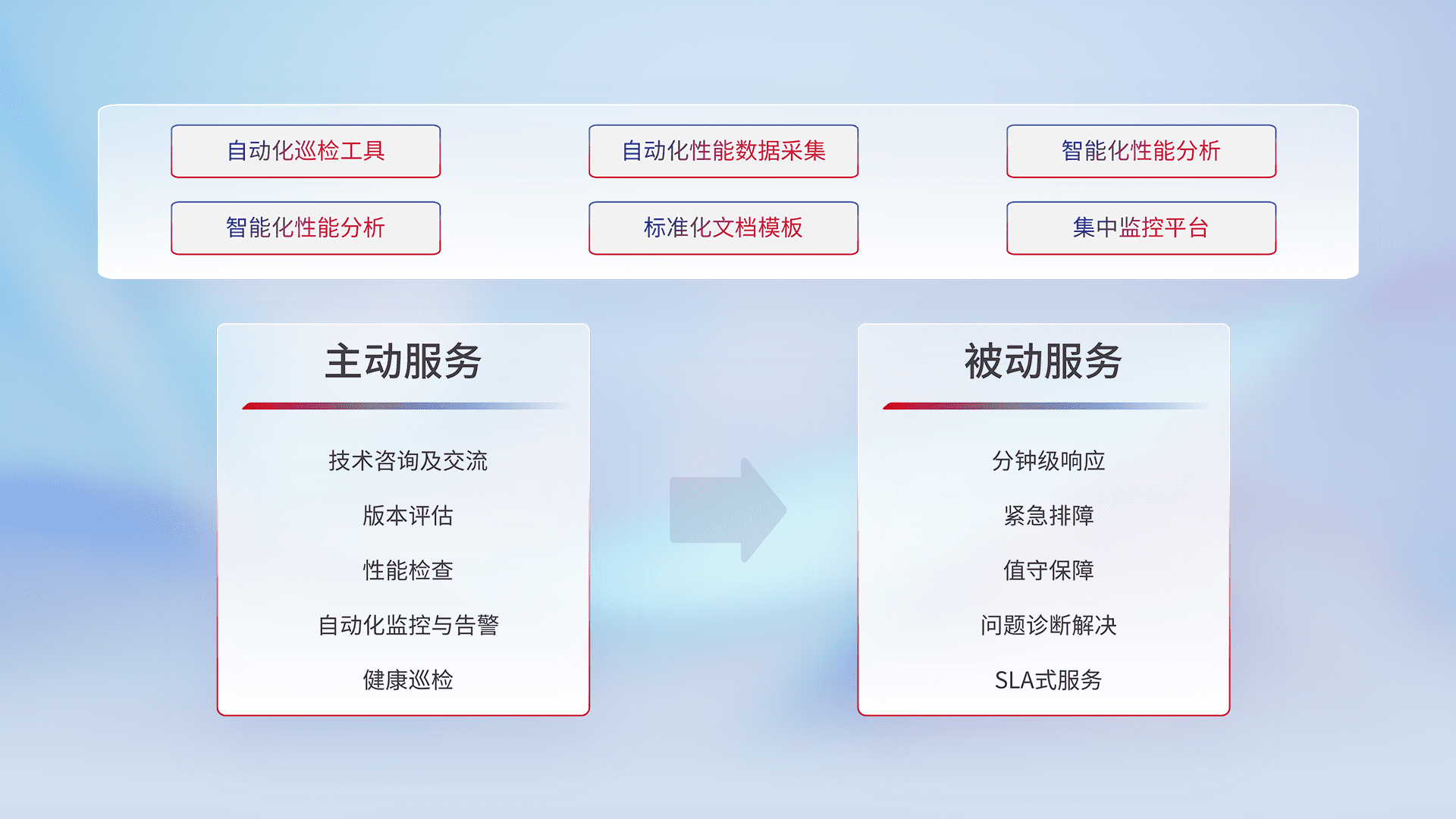 智能化工具和标准化文档,,,,保障服务质量,,提供主动服务(包含技术咨询、、版本评估、、、、性能检查、、自动化监控与告警、、、、健康巡检)和被动服务包含(分钟级响应、、、紧急排障、、、、值守保障、、问题诊断解决、、SLA服务)。。