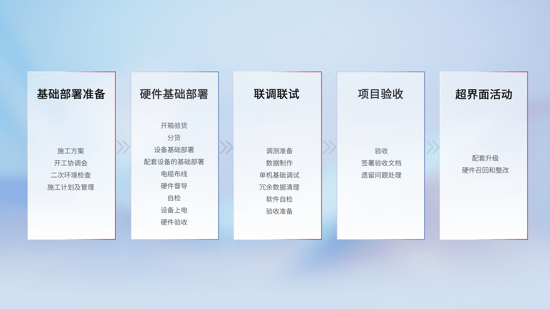 从基础部署准备、、硬件基础部署、、、联调联试、、项目验收、、、越界面活动的全过程可追溯,,,保证施工质量和进度。。。